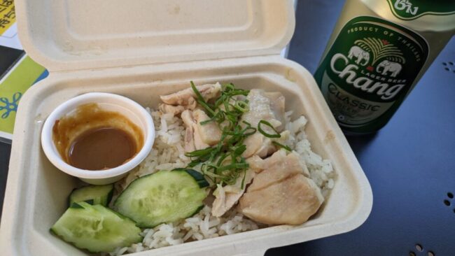 レストランはどこも並んでいたので、タイ館の裏口から入ってテイクアウトランチ。オープンキッチンでタイのシェフが作ってくれたカオマンガイは最高。