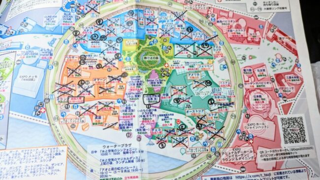 一番最初は地図すら持って行かなかったが、2回目からは、Xで有名になった辻さん作成の地図を印刷して持っていくようになった。行ったパビリオンには×印をつけ、まだ行けていないところを目指す。