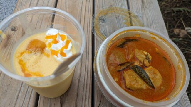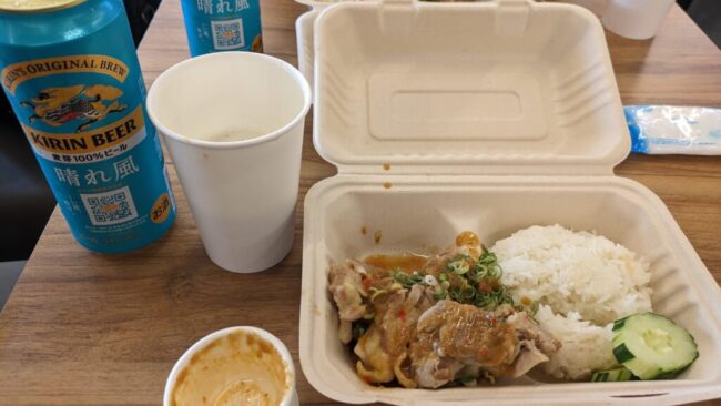 食事は、どのレストランも相変わらずの長蛇の列。そこで、私が1回目に食べて美味しかったタイ館のカオマンガイをテイクアウトし、ファミマの上のフードコートで食べた。