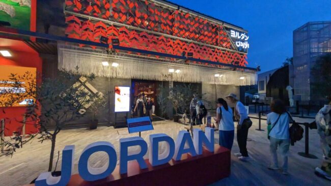 行けていなかったパビリオンをいくつか回った後、現地の砂漠の砂を踏める大人気のヨルダン館に向かった。しかし、混み過ぎて入場制限がかかっていて入れず、さらに「明日から完全事前予約制になります」という看板が掲げられていた。