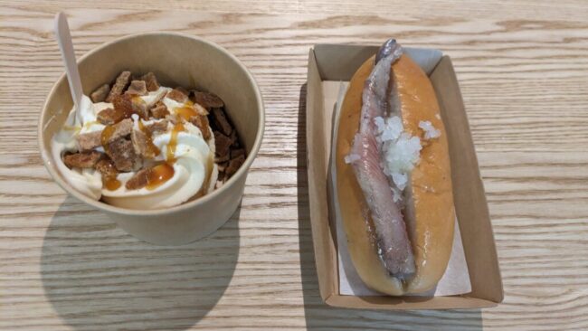 この頃には並べないどころか「入れない万博」自体が貴重なものになり、金銭感覚がかなりバグってきていた。ニシンサンドとソフトクリームで全部で1,400円。